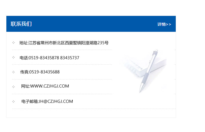 地址:常州市新北區友邦商務大廈1幢16、17層  電話:0519-85101652  傳真:0519-85112595  郵編:213022  網址:www.cz-jiayue_cn.czhuiyu.com  郵箱:xiajifengaa@163.com
